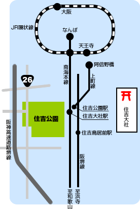 南海本線:「住吉大社駅」徒歩約2分。(南海難波駅から各駅停車で約9分)